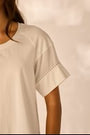 The Alby Top reinvents a classic tee with elevated detailing for a modern edge. Soft viscose inserts contrast elegantly at the sleeves and hem, while a round neckline and short raglan sleeves create a relaxed fit. A subtle silver taped cuff adds shine, making this top effortlessly versatile from laid back casual to polished chic.