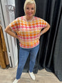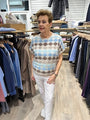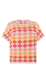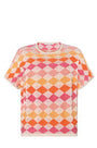 The Domini top by Mansted blends comfort with artistry, featuring a multicoloured plated diamond pattern on breathable organic cotton. Its relaxed, dropped-shoulder silhouette tapers gently at the hem for a flattering, feminine shape — a perfect blend of casual ease .