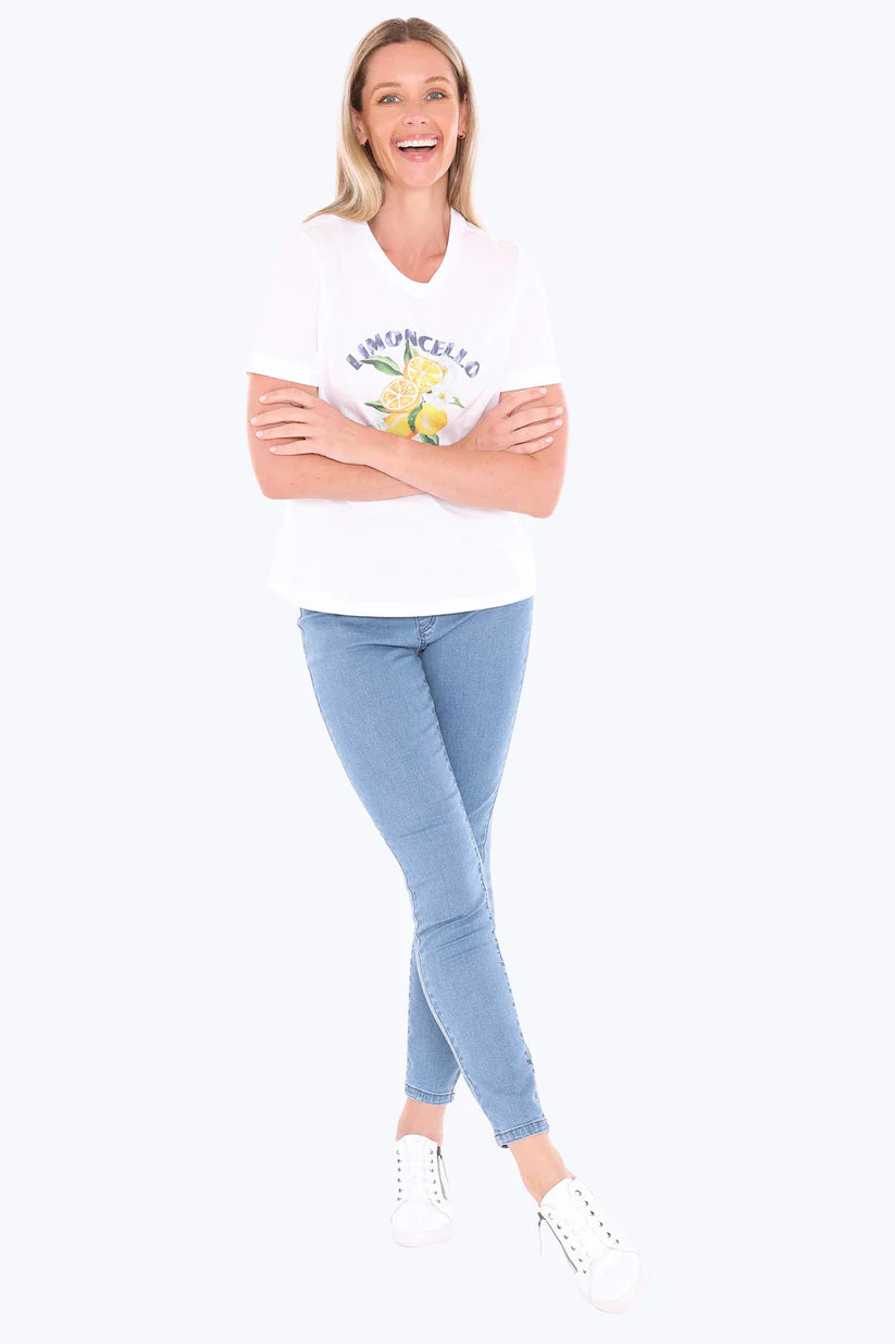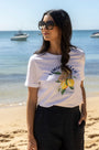 The Limoncello Tee brings a burst of sunshine to your wardrobe with its playful lemon graphic and bold lettering.