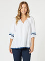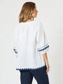 Playful and effortlessly stylish, the Ric Rac Top brightens your everyday wardrobe with its cheerful design. Made from textured white cotton, it features a soft V-neck with tie detail, 3/4 elasticated sleeves, the blue and light blue trims add a fun, feminine touch. Its relaxed fit and gently curved hem create a breezy silhouette perfect for pairing with navy Santorini Pants or denim jeans, bringing a fresh and uplifting vibe to your casual looks.