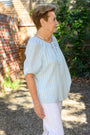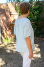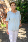 Crafted from Feel Good linen, this beauty features soft blue and white stripes with a cheeky hint of gold thread running through. The fabric drapes beautifully against your skin, while the rounded neckline and mid-length sleeves keep things relaxed and comfortable. Perfect for those days when you want to look put-together without trying too hard.